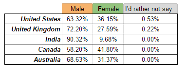 Of the 1,089 women who took the survey, 63.32% are from the United States. Overall, there are more U.S. women represented, but when we filter down to individual countries, we see a more erratic breakdown of men versus women: