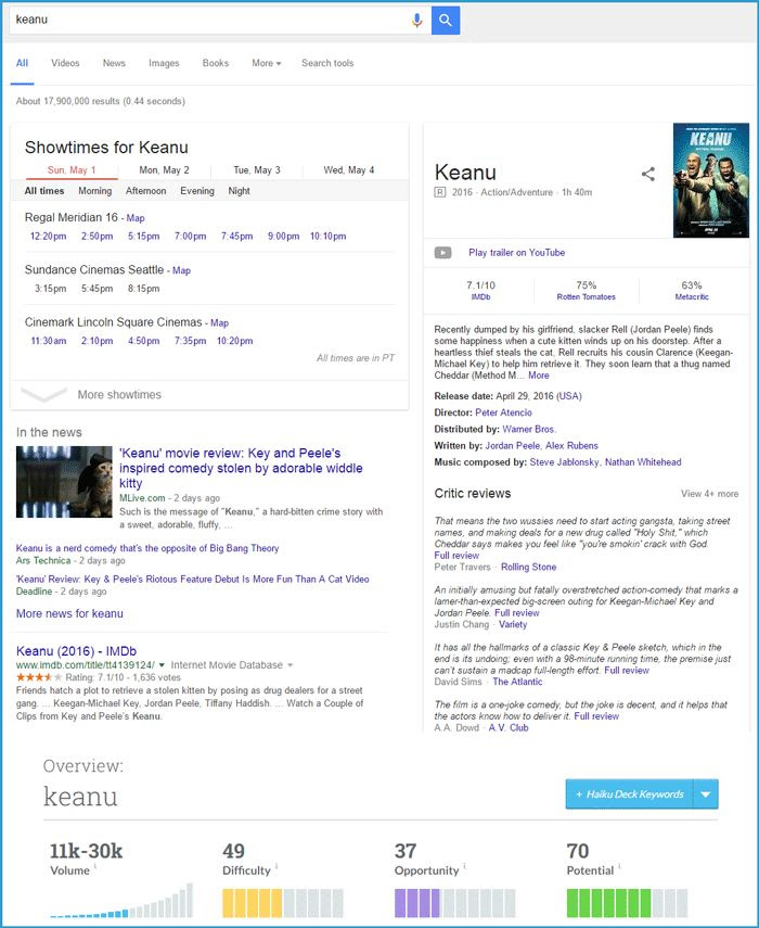 The search above for "Keanu" has an instant answer, knowledge graph, news results, and images (further down). Hence, its Opportunity Score is a measly 37/100, which means our model estimates ~37% of clicks go to the organic results.