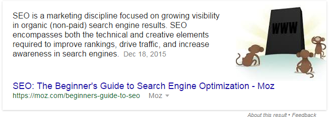 Moz ranks on page one for that search, but it still begs two questions: (1) is the ranking page the best answer to the question (in Google's eyes), and (2) what content on the page do they see as best matching the question. Fortunately, you can use the "site:" operator along with your search term to help answer both questions. Here's a Featured Snippet for [site:moz.com "what is seo"]: