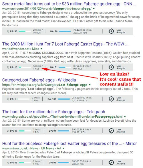 This one's dead simple. We need to change our biased thinking about links and content from the days of 2012. Back then, it was still the case that a few more links with anchor text would move even an irrelevant, low-quality page of content above better and more valuable pages. Today, it's vastly more likely that very-well-linked-to pages (as in the example above) are getting their butts handed to them by marketers who go above and beyond with their on-page SEO efforts, winning despite a link deficit because they deliver the content and the experience Google (and searchers) want.